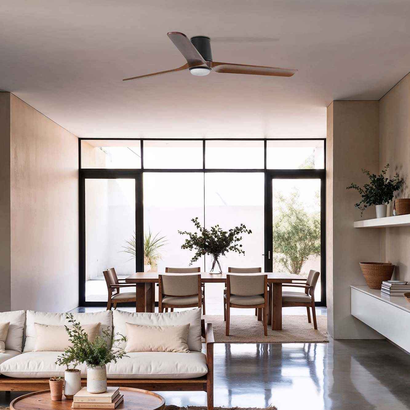 Ces ventilateurs sont particulièrement recommandés pour les plafonds bas (moins de 2,7m) où l'espace est limité. L'éclairage LED intégré offre une durée de vie de 25 000 heures en moyenne.